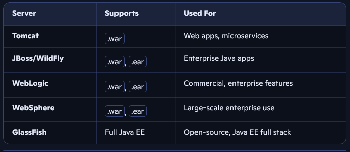 In Java development, various application servers are used depending on the type and complexity of the application.